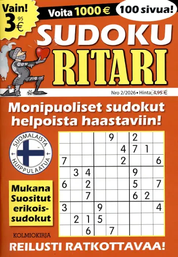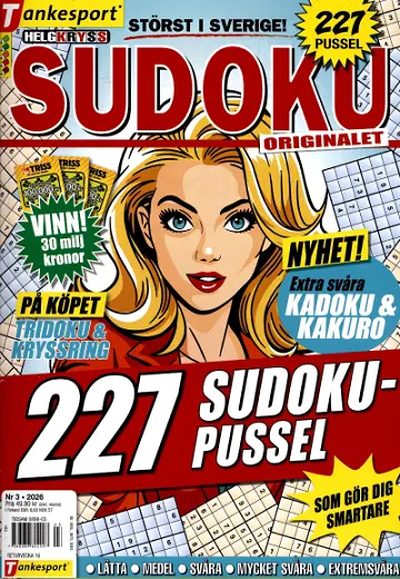 Eri tasoisia ja mallisia sudokuja, myös palkintotehtäviä. Lehdessä ohjeet suomen lisäksi ruotsiksi,...