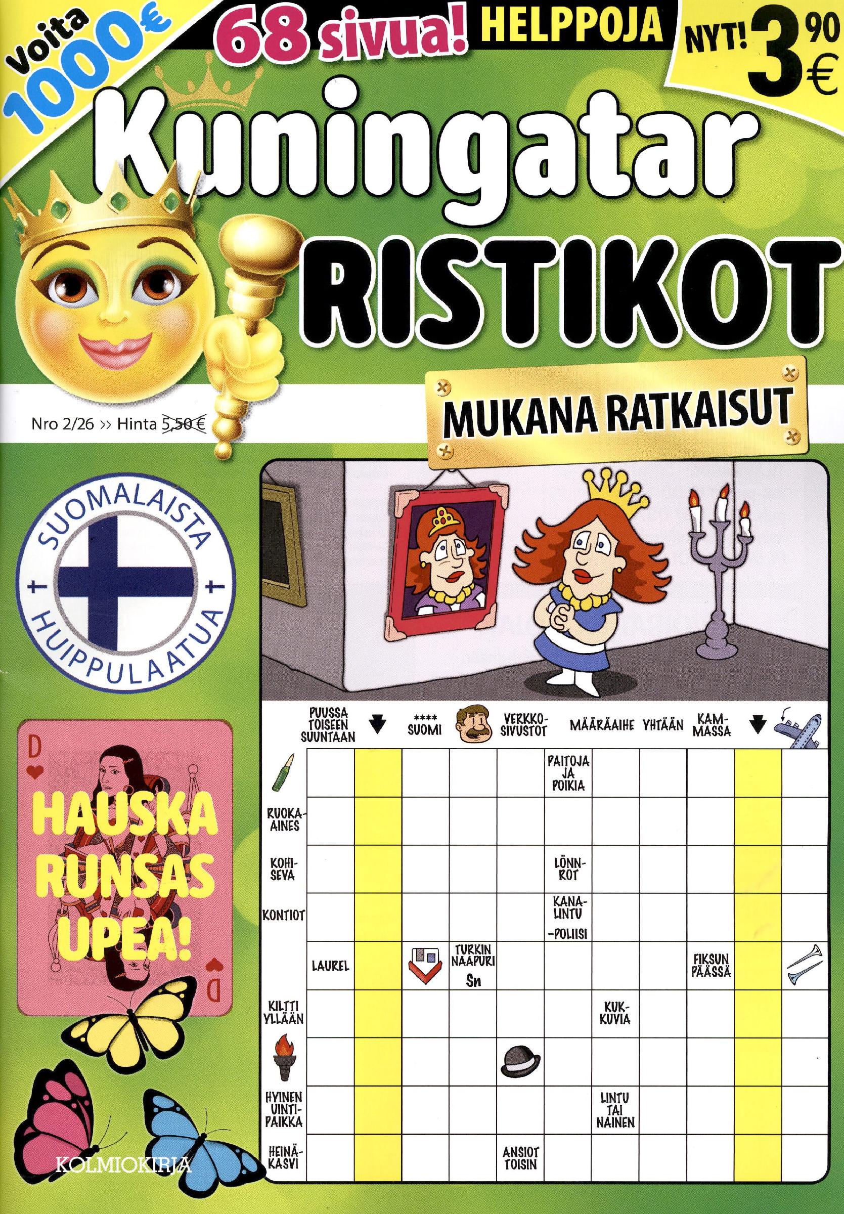 Runsas 68-sivuinen ristikko, jonka sisällössä Suomen kärkitason laatijat painottavat helppoutta, ajankohtaisuutta ja huumoria