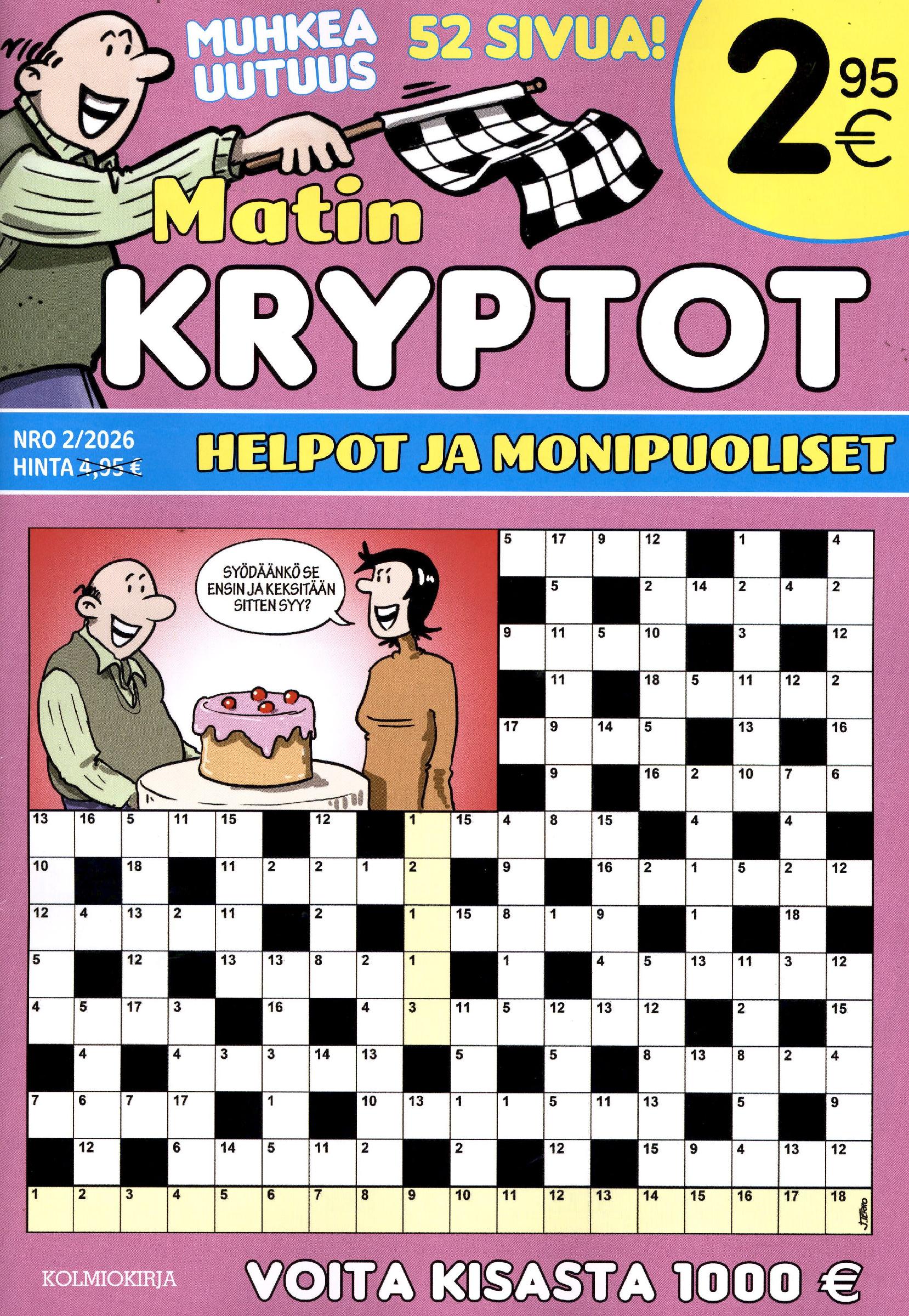 Tuhti kryptopaketti joka sisältää kattauksen helppoja ja sanastoltaan laadukkaita tehtäviä Suomen arvostetuilta kryptolaatijoilta. Mukana on niin ikään paljon suosittuja erikoistehtäviä, jotka tuovat monipuolisesti lisämausteita ratkontaan. Kaikkien tehtävien ratkaisut voi tarkistaa lehden loppuosasta, joten aloittelevatkin ratkojat pääsevät helposti mukaan kryptojen maailmaan.