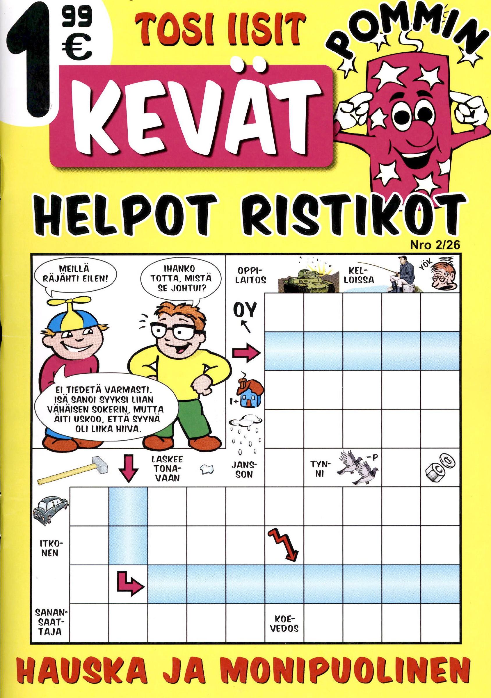 Tehtäviltään pääosin helppoja ja helpohkoja humoristisia ristikoita. Kätevästi mukana kulkevassa koossa. Mukana oikeat ratkaisut.