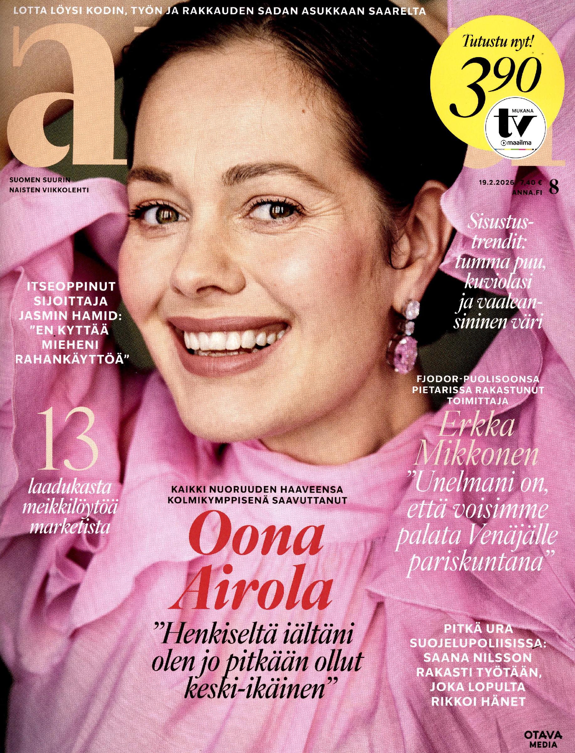 2,95 €Suomen ostetuin naisten viikkolehti. Mielenkiintoiset ihmiset ja ajankohtaiset tapahtumat joka keskiviikko. Anna pitää lukijansa ajan tasalla siitä, mitä naisen elämästä pitää juuri nyt tietää. Lehti on täynnä koeteltuja vinkkejä kauneudenhoidosta, hyvinvoinnista, ruoasta, matkailusta ja kulttuurista. Annan muotiartikkelit antavat raikkaita ideoita pukeutumiseen myös uutta ja vanhaa yhdistelemällä. Talousartikkeleissa Anna pureutuu säästämiseen ja sijoittamiseen oikeiden esimerkkien kautta. Annan mukana saat nyt 24-sivuisen kattavan TV-Maailman, joka on kätevä irrottaa sohvapöydälle koko viikoksi.