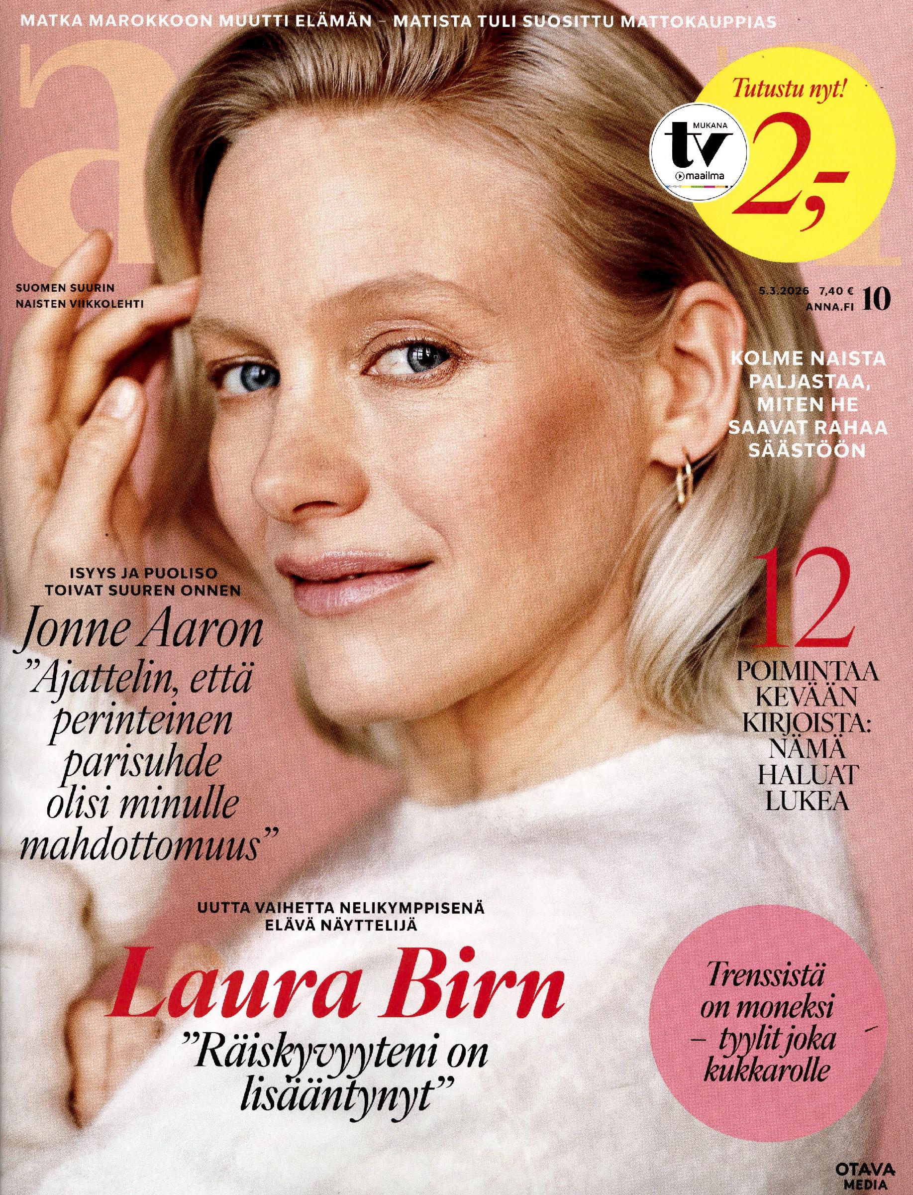 2,00 €Suomen ostetuin naisten viikkolehti. Mielenkiintoiset ihmiset ja ajankohtaiset tapahtumat joka keskiviikko. Anna pitää lukijansa ajan tasalla siitä, mitä naisen elämästä pitää juuri nyt tietää. Lehti on täynnä koeteltuja vinkkejä kauneudenhoidosta, hyvinvoinnista, ruoasta, matkailusta ja kulttuurista. Annan muotiartikkelit antavat raikkaita ideoita pukeutumiseen myös uutta ja vanhaa yhdistelemällä. Talousartikkeleissa Anna pureutuu säästämiseen ja sijoittamiseen oikeiden esimerkkien kautta. Annan mukana saat nyt 24-sivuisen kattavan TV-Maailman, joka on kätevä irrottaa sohvapöydälle koko viikoksi.