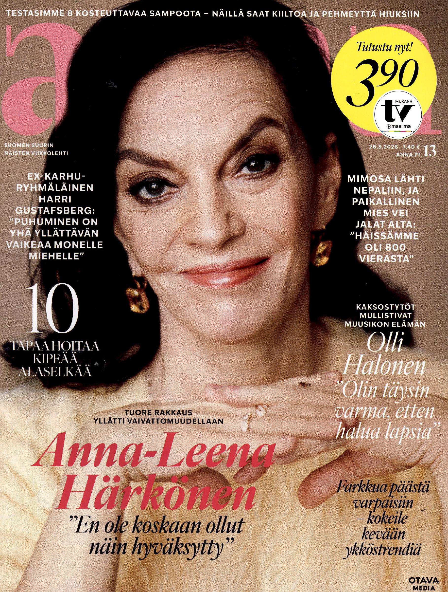 3,90 €Suomen ostetuin naisten viikkolehti. Mielenkiintoiset ihmiset ja ajankohtaiset tapahtumat joka keskiviikko. Anna pitää lukijansa ajan tasalla siitä, mitä naisen elämästä pitää juuri nyt tietää. Lehti on täynnä koeteltuja vinkkejä kauneudenhoidosta, hyvinvoinnista, ruoasta, matkailusta ja kulttuurista. Annan muotiartikkelit antavat raikkaita ideoita pukeutumiseen myös uutta ja vanhaa yhdistelemällä. Talousartikkeleissa Anna pureutuu säästämiseen ja sijoittamiseen oikeiden esimerkkien kautta. Annan mukana saat nyt 24-sivuisen kattavan TV-Maailman, joka on kätevä irrottaa sohvapöydälle koko viikoksi.