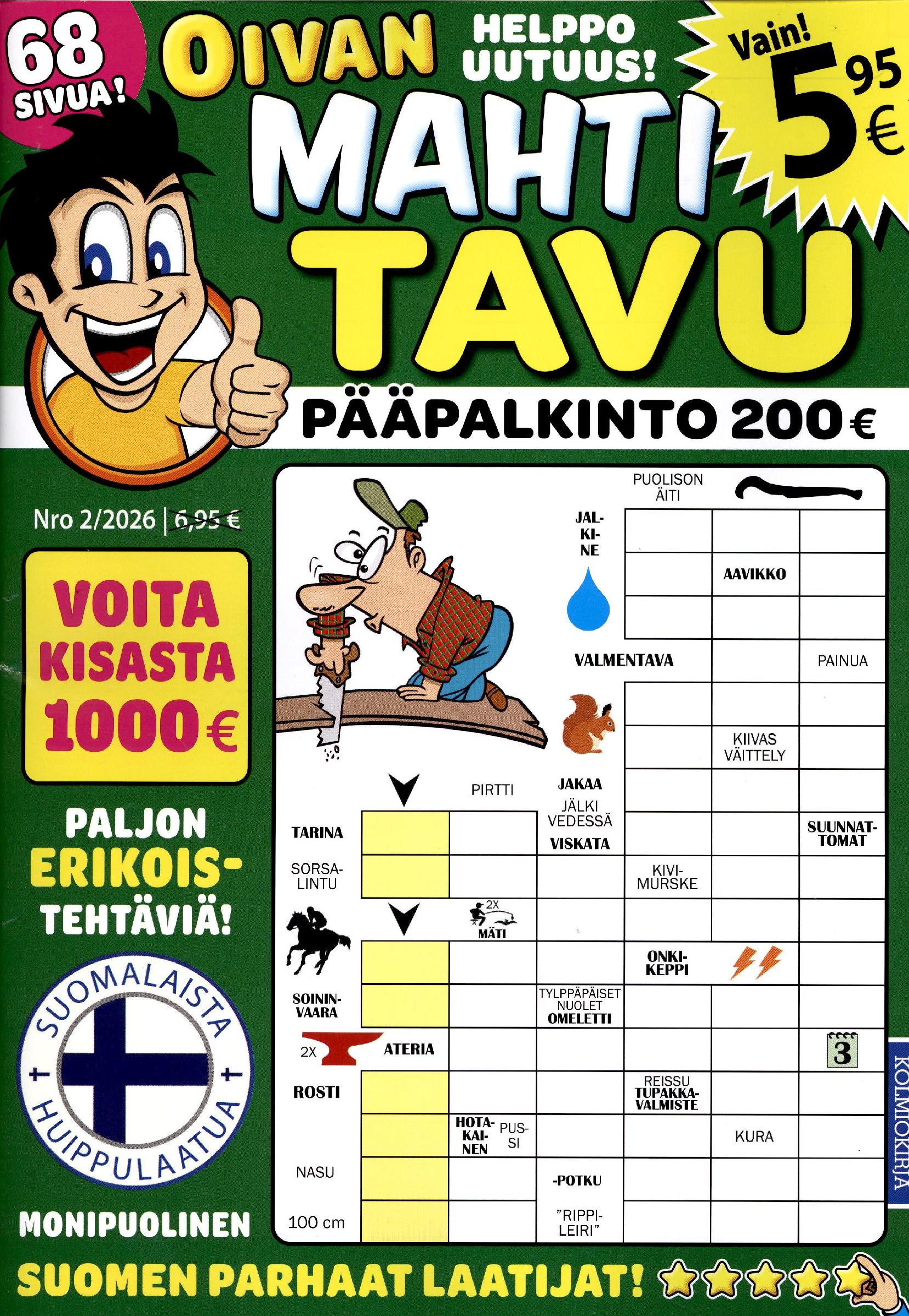 5,95 €Koostuu sopivan helpoista tavuristikoista. Lehden sisältö on tuhti paketti rentouttavaa aivojumppaa. 68-sivuinen formaatti on asiakkaiden toive: mukaan mahtuu muhkea määrä erilaista tekemistä. Monipuoliset erikoistehtävät kuten tavukierrot, yhdistelmäristikot ja tavupiilosanat tuovat lisämaustetta ratkontaan. Lehden lopusta löytyy ratkaisuosio, josta saa ratkonta-apua tiukan paikan tullen.