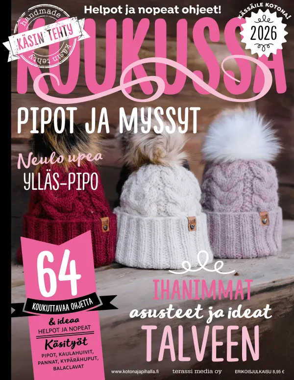 Tee itse helpot, hauskat ja näyttävät pipot – ne syntyvät vaikka yhdessä illassa. Lehden sivuilta löydät ideoita ja vinkkejä myös pipojen ja myssyjen personointiin: tupsuja, palloja, merkkejä, hapsuja ja muita yksityiskohtia, joilla teet jokaisesta päähineestä oman näköisesi.