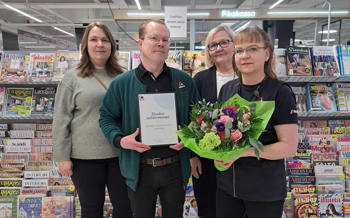 Kuvassa vasemmalta alkaen: Lehtipisteen myyntineuvottelija Salla Mäkelä, Prisma Hämeenkadun palvelupäällikkö Mikael Vainikainen, Lehtipisteen avainasiakaspäällikkö Sanna Lehtinen ja lehtipisteenhoitaja Päivi Arhenius.