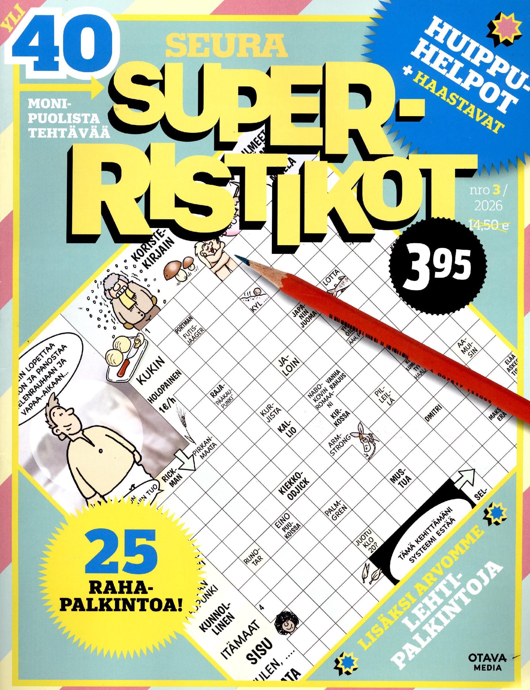 3,95 €Seura SuperRistikot tarjoaa ratkojille alan monipuolisimman tehtäväkirjon ja runsaasti voitettavia palkintoja: jokaisen lehden ratkojien kesken arvotaan selvää rahaa sekä laadukkaita lehtipalkintoja. Lehti sisältää n. 40 ratkaistavaa tehtävää, jotka ovat maan tunnetuimpien laatijoiden käsialaa. Löydät lehdestä muun muassa perinteisiä sana- ja kuvaristikoita, eksoottisempia japanilaisia ristikoita, kryptoja, piilosanoja, tavuristikoita, sudokuja sekä suosittuja tietovisoja.