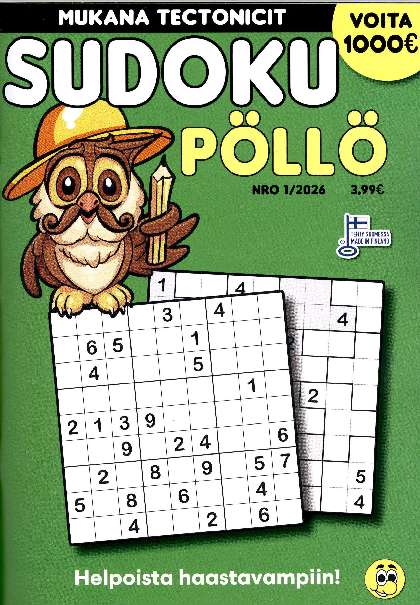 3,99 €100-sivuinen Sudoku Pöllö on laadukas kattaus helppoja ja haastavia sudokuja, jotka ilahduttavat eri ikäisiä sudokujen ratkojia. Kätevän kokoinen myös matkalle. Mukana myös eriksoissudokuja, sekä Onnen kisa, josta voi voittaa 500 euroa.