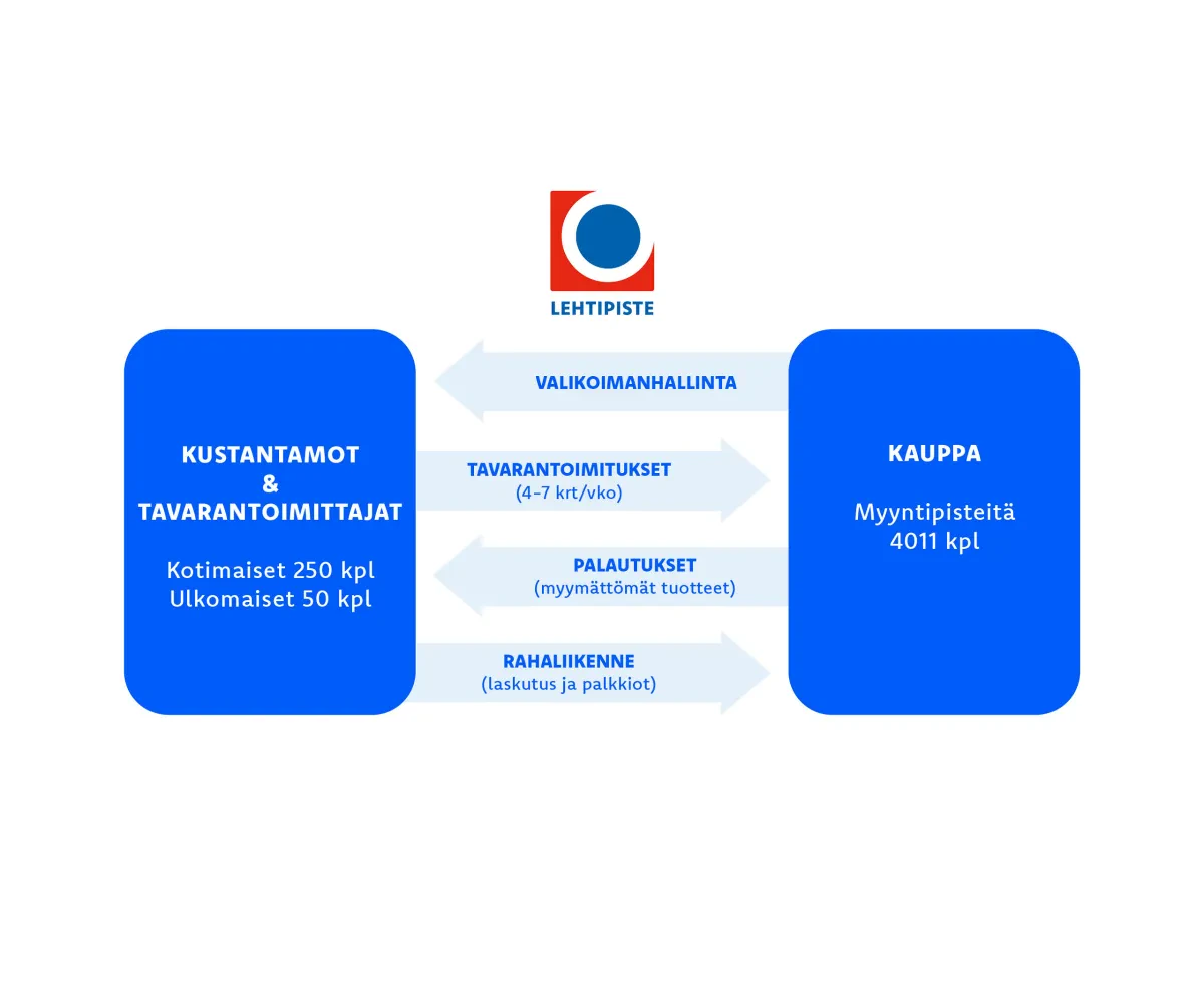 Me Lehtipisteellä hoidamme yhteistyökumppaneidemme tuotteiden jakelun kauppoihin, myyntipistekohtaisen valikoimanhallinnan sekä toimimme linkkinä kaupan- ja tavarantoimittajien välillä. Valikoimaamme kuuluu kattava valikoima aikakaus- ja sanomalehtien irtonumeroita, kirjoja, erilaisia keräilytuotteita, sekä muita tuotteita. Yhteistyökumppaneinamme Suomessa ja ulkomailla on noin 300 kustantajaa ja tavarantoimittajaa.