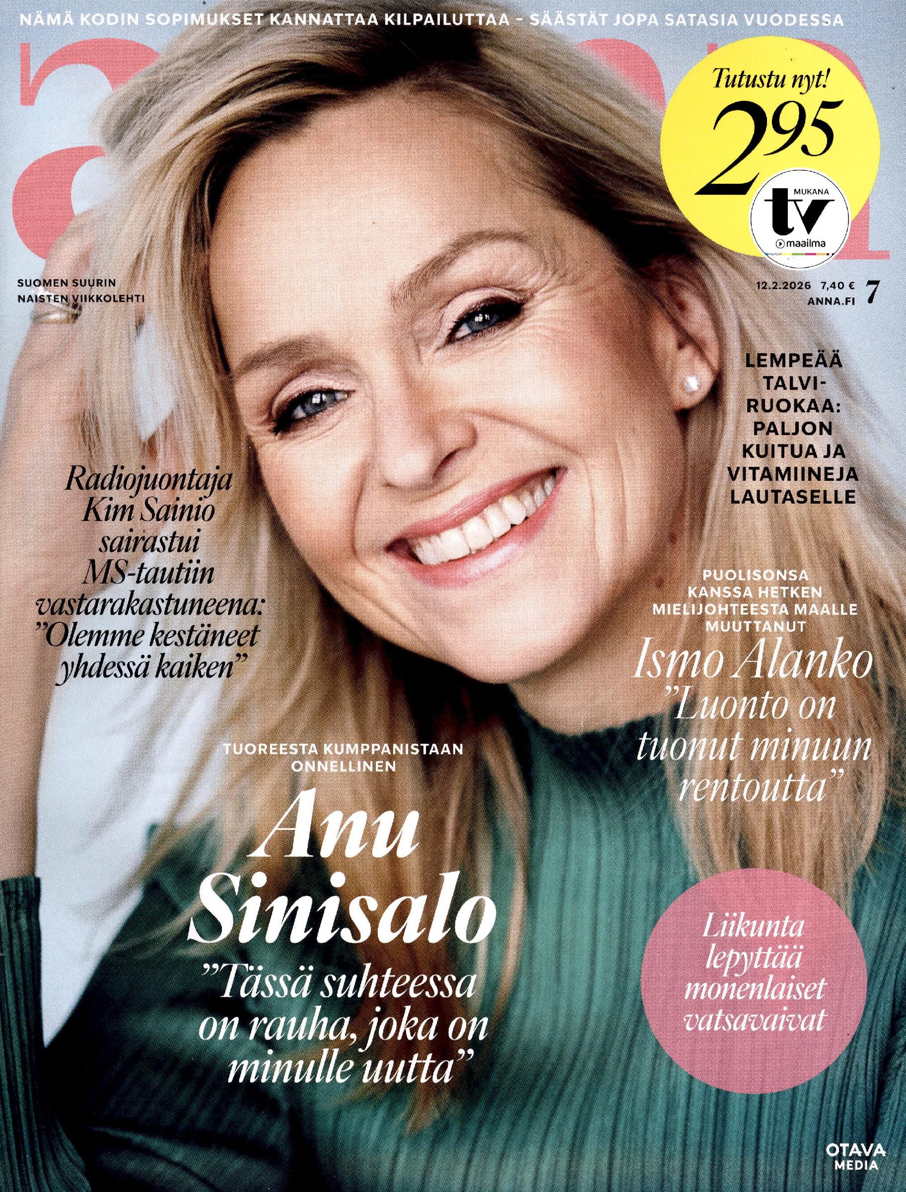 Suomen ostetuin naisten viikkolehti. Mielenkiintoiset ihmiset ja ajankohtaiset tapahtumat joka keskiviikko. Anna pitää lukijansa ajan tasalla siitä, mitä naisen elämästä pitää juuri nyt tietää. Lehti on täynnä koeteltuja vinkkejä kauneudenhoidosta, hyvinvoinnista, ruoasta, matkailusta ja kulttuurista. Annan muotiartikkelit antavat raikkaita ideoita pukeutumiseen myös uutta ja vanhaa yhdistelemällä. Talousartikkeleissa Anna pureutuu säästämiseen ja sijoittamiseen oikeiden esimerkkien kautta. Annan mukana saat nyt 24-sivuisen kattavan TV-Maailman, joka on kätevä irrottaa sohvapöydälle koko viikoksi.