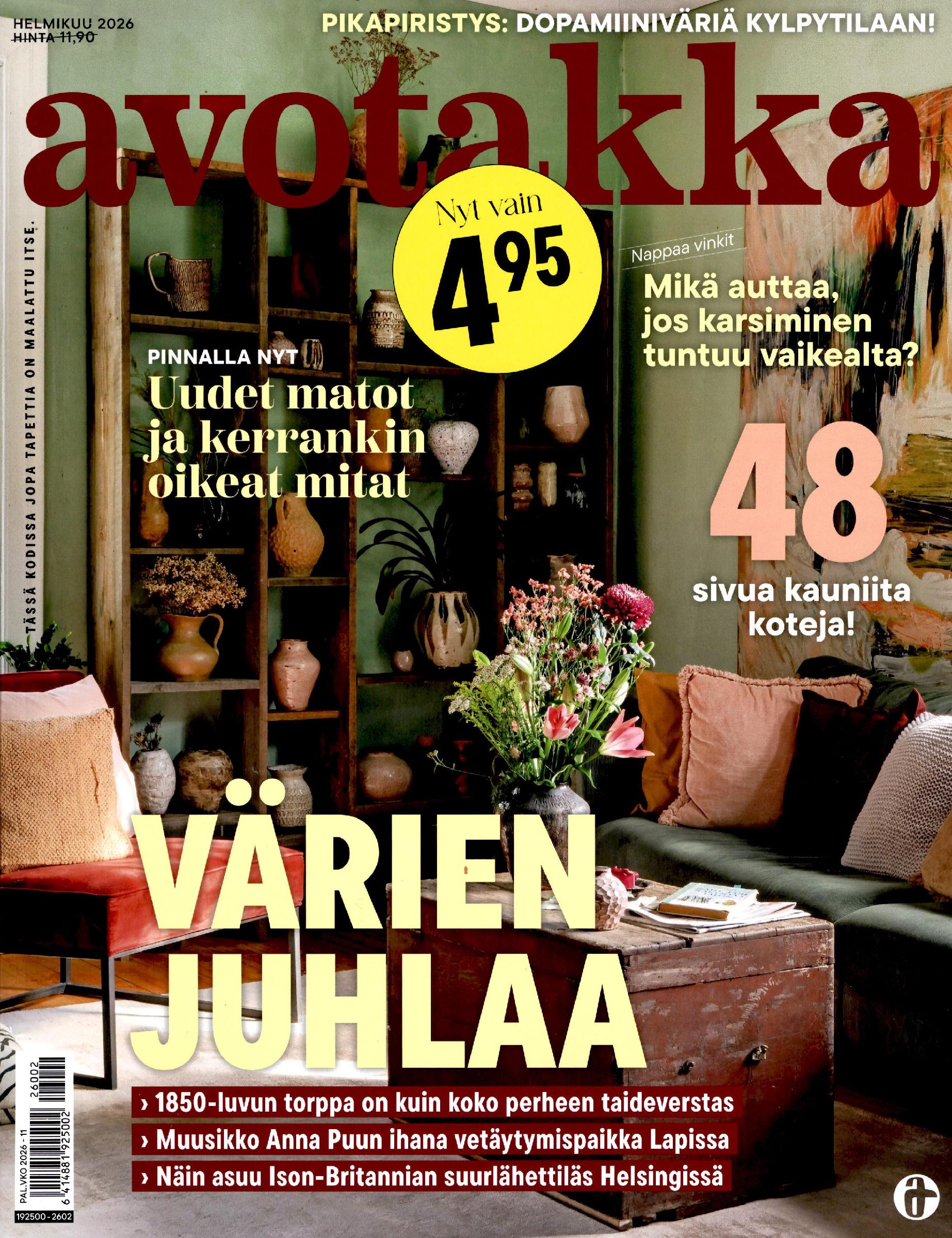 Sisustamisen laadukas erikoislehti. Ihanien kotien, sisustusideoiden ja -neuvojen lisäksi Avotakka pitää ajan tasalla myös muotoilun ja antiikin ilmiöistä.