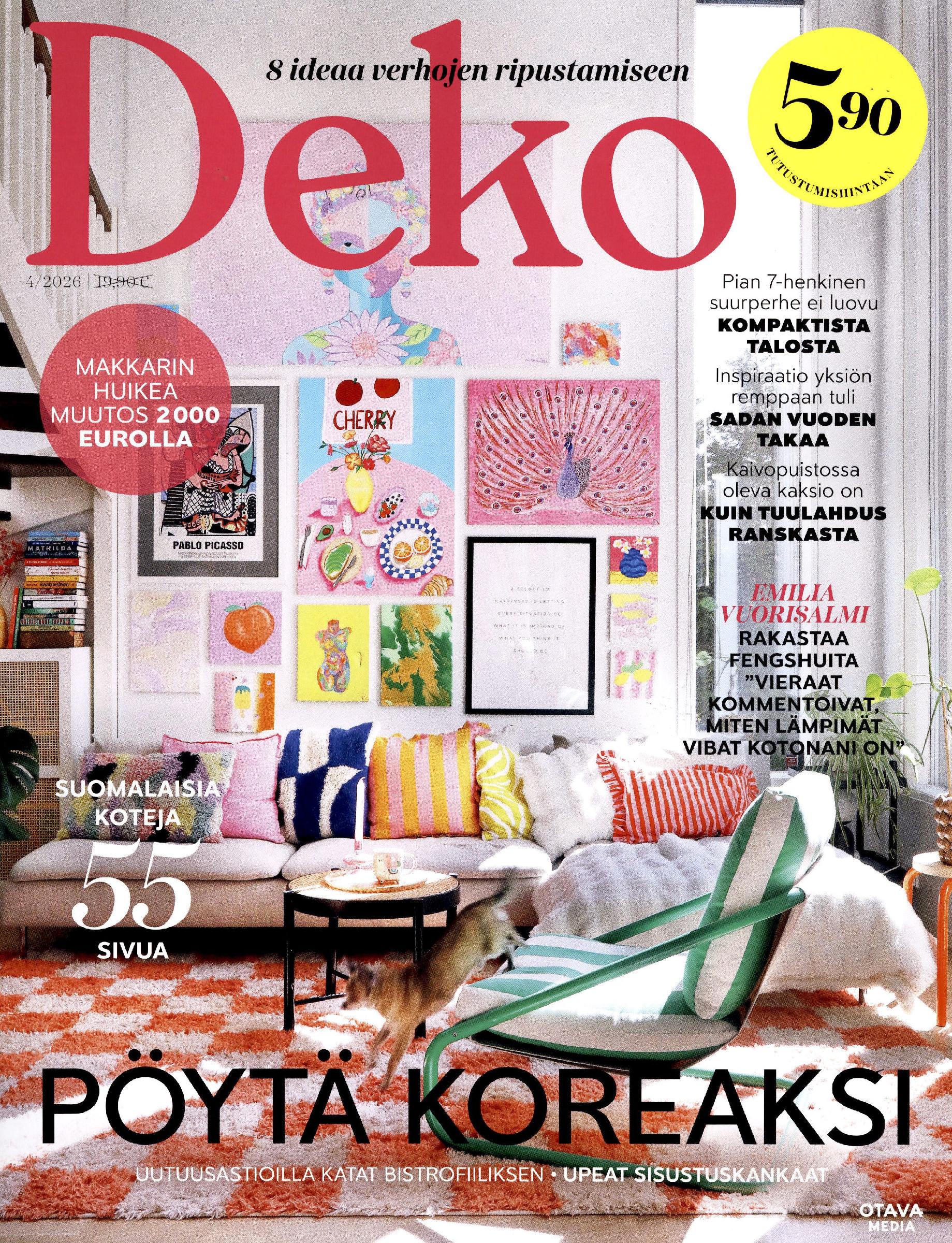 5,90 €Deko on suomalaisten sisustuslehtien rento ja nuorekas edelläkävijä. Sivuilta löydät ihania suomalaiskoteja eri budjeteilla toteutettuna. Rohkeat ratkaisut ja yllättävät valinnat ovat rakastetun lehden suola. Deko on enemmän kuin pelkkä kuvalehti. Se opastaa ostamaan vastuullisesti ja ekologisesti, esittelee himotuimmat design-esineet sekä opastaa eri tilojen sisustushaasteissa. Lehdessä on mukana sisustusalan sekä taiteen kiinnostavia ja ajankohtaisia nimiä.