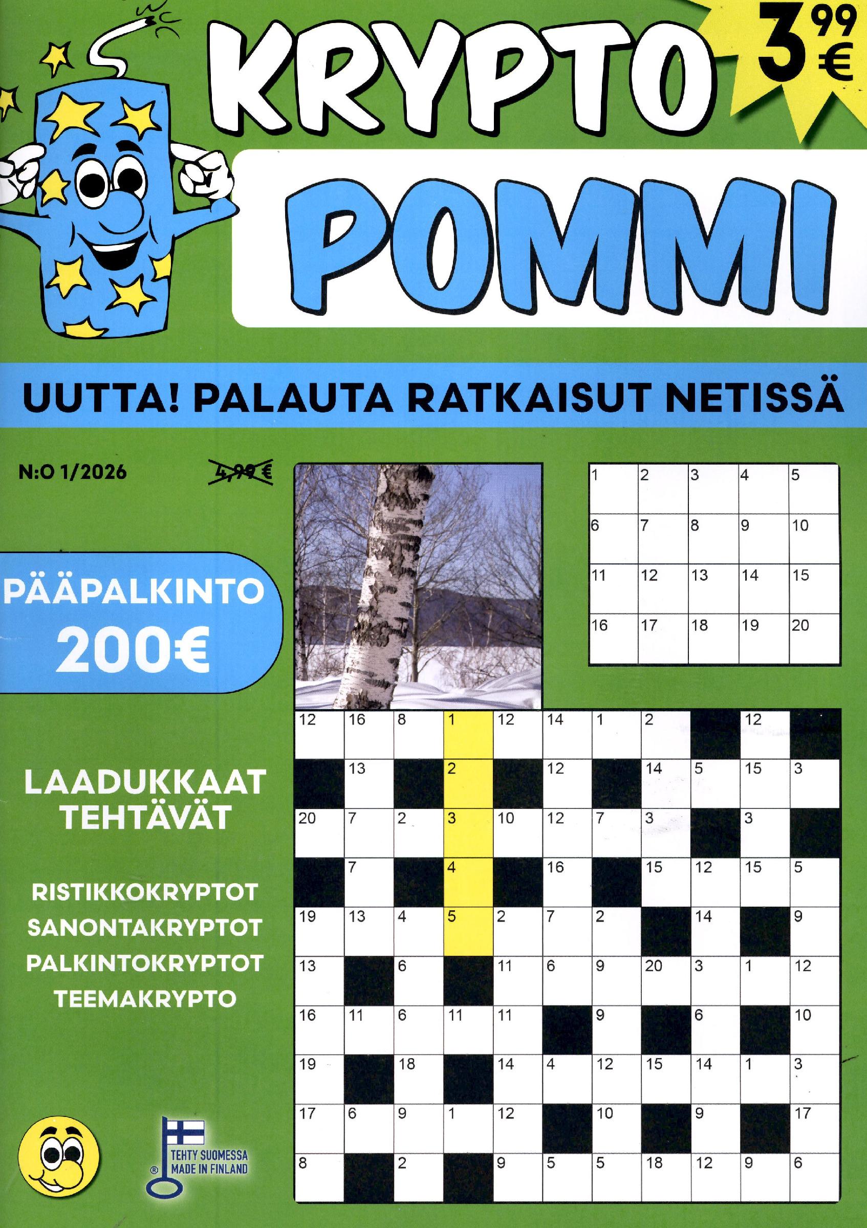 Monipuolisia, laadukkaita ja hauskoja kryptotehtäviä, jotka ovat pääosin helppoja. Peruskryptojen lisäksi mm. aforismi- ja vitsikryptoja. Rahapalkintoja.