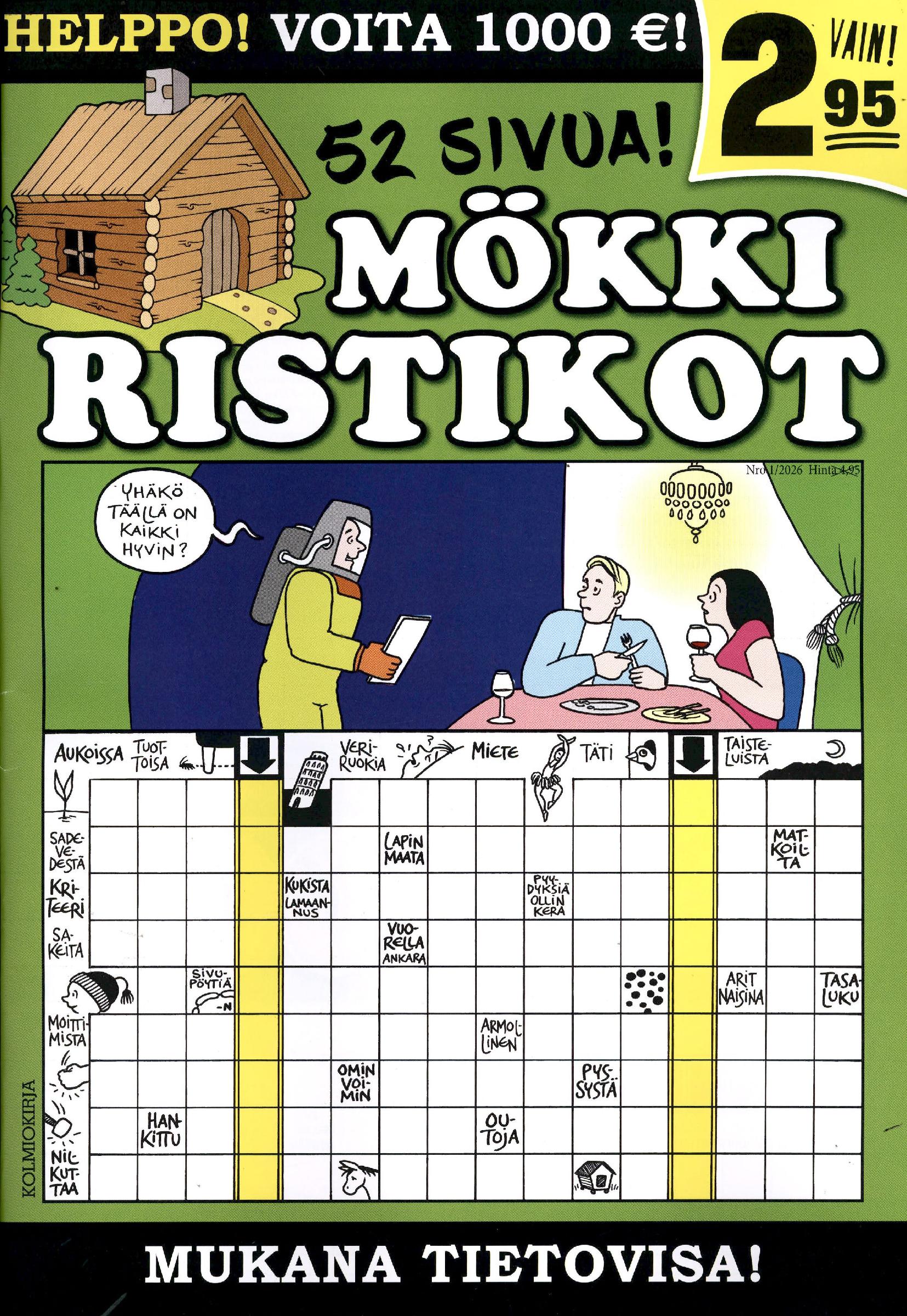 Pääosa helppoja kuvaristikoita. Lisäksi sanahakuja, kryptoja, tavuristikoita sekä sokkeloita ja väritystehtäviä, joiden parissa perheen pienempi väki viihtyy. Palkintotehtävästä rahapalkinto. Mukana myös bonuskilpailu, josta voi voittaa 1000 euroa!