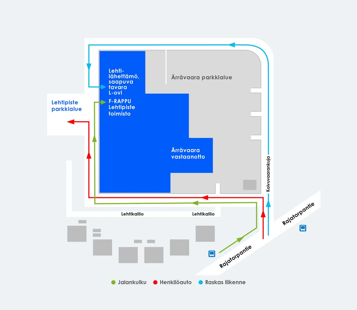 Saapuessasi meille jalan tai julkisilla, suosittelemme kiinteistön vasemmalla reunalla kulkevaa kävelytietä, joka kiertää rakennuksen. Rajatorpantielle pysähtyy useita eri busseja ja pysäkiltä on matkaa Lehtipisteelle noin 100 metriä.
